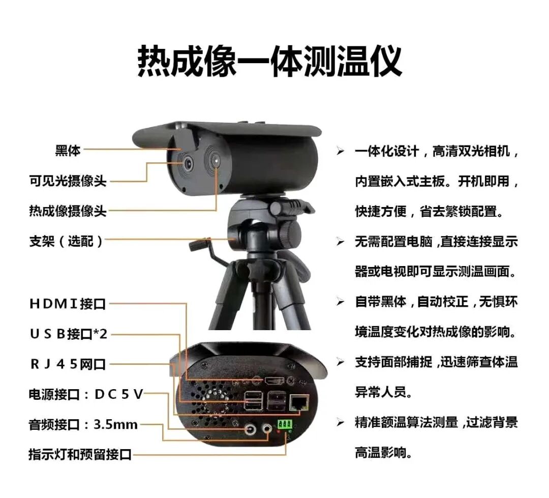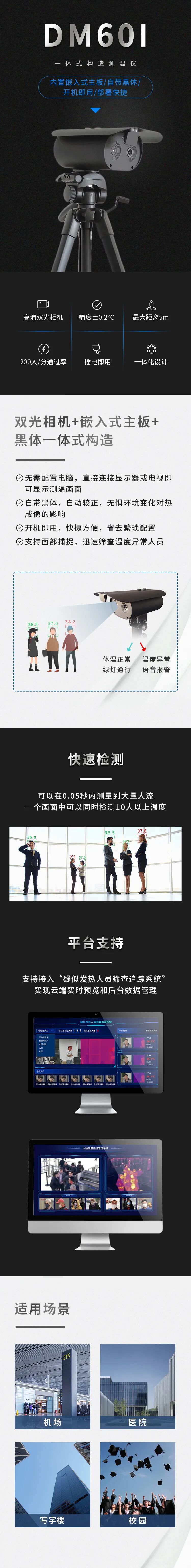DM601热成像测温一体机: DM601热成像测温一体机,集成高灵敏度红外相机、高清可见光相机、高精度黑体、高性能人脸测温引擎、人工智能算法为一体,结构小巧、安装方便、使用简单。系统自动人脸检测、抓拍和识别,毫秒级探测人员额头热感温度,自动实时校准测温精度、额温、腋温精度,人体测温精确度达到±0.3℃。可与人脸识别云平台无缝对接,准确识别和统计路过的人数,同时快速分析显示个体人员温度。 基于人工智能算法及红外热成像测温技术,可快速对人群中发热症状的人员进行排查和示警,并精确显示人脸区域最高温度值。该设备广泛用于机场、车站、学校、医院、工厂、商场等大型公共场所。 产品优势: 用于远距离人体温度检测 ,测温距离1.5m~5m 集高灵敏度红外相机、高清可见光相机、高精度黑体、高性能人脸测温引擎、人工智能算法为一体 无需电脑直接连接显示器 自带黑体、人体温度自动、智能校准算法,无惧环境温度变化对热成像测温的影响 精准额温算法,过滤背景高温影响 与云端服务器无缝对接,轻松连接,中心远程实时监控、大数据分析